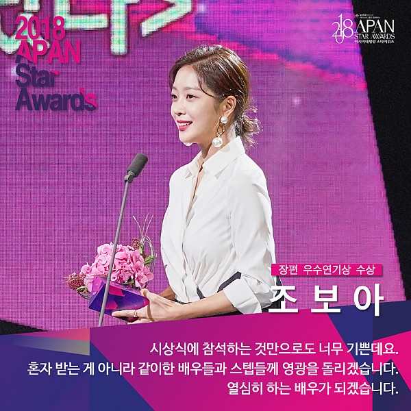 '2018 APAN Star Awards' 장편드라마 여자 우수연기상 조보아 페이지 정보 작성자 연매협 작성일18-10-26 14:05 조회9,516회 본문 ▲ 장편드라마 여자 우수연기상 조보아(MBC '이별이 떠났다') 이전글 다음글 목록