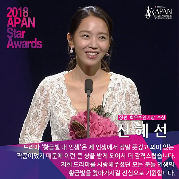 '2018 APAN Star Awards' 장편드라마 여자 최우수연기상 신혜선 페이지 정보 작성자 연매협 작성일18-10-26 14:08 조회12,389회 본문 ▲ 장편드라마 여자 최우수연기상 신혜선(KBS2 '황금빛 내 인생') 이전글 다음글 목록