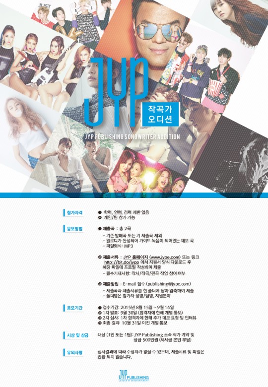 한편, JYP 퍼블리싱은 이번 오디션을 통해 박진영 대표 프로듀서, 홍지상(2PM 준호 솔로 음반 ‘소 굿(SO GOOD)’의 타이틀곡 포함 전곡 공동 작업), 심은지(백아연 ‘이럴 거면 그러지 말지’, 15& 타이틀 곡 및 인피니트 ‘엔딩을 부탁해’ 작사, 작곡), 이우민(빌보드 선정 2015 상반기 최고의 K팝 솔로 데뷔곡 박지민 ‘Hopeless Love’ 작곡, 핫펠트, 지소울 등 음반 공동 프로듀싱), 노데이(갓세븐, 비스트, 카라, 동방신기, 샤이니, 소녀시대 등 다수 아티스트 앨범 참여), 등 재능 있는 신예 작곡가 발굴에 힘쓸 예정이다.